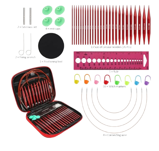 A Circular Knitting Needle Set is a versatile knitting tool designed for creating both flat and circular knitted projects with ease. This set usually includes multiple needle tips in different sizes along with flexible cables that connect the tips, allowing knitters to adjust the needle length according to their project. Circular knitting needles are commonly made from materials such as stainless steel, aluminum, bamboo, or plastic, providing durability and smooth yarn movement. The flexible cable reduces hand strain and evenly distributes the weight of large projects like sweaters, blankets, scarves, and hats. Many circular knitting needle sets also come with connectors, stoppers, and a compact storage case to keep all components organized. These sets are ideal for beginners and professional knitters alike, offering convenience, portability, and the ability to work on a wide variety of knitting patterns efficiently. 🧶✨